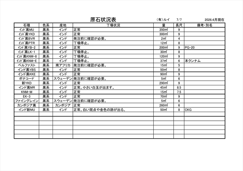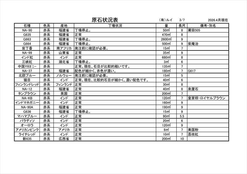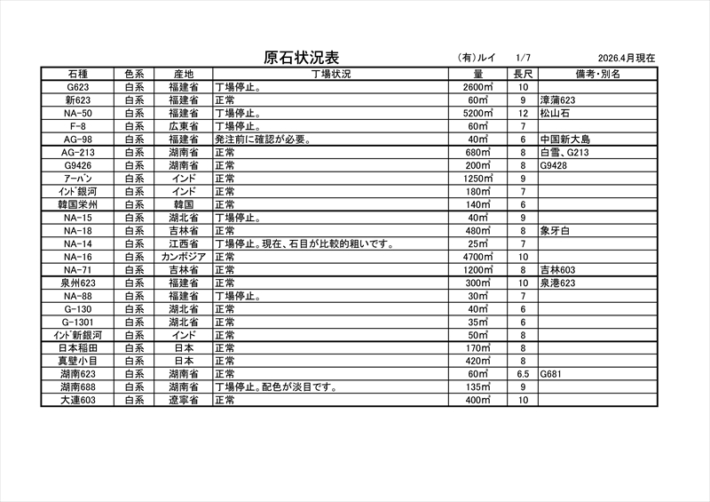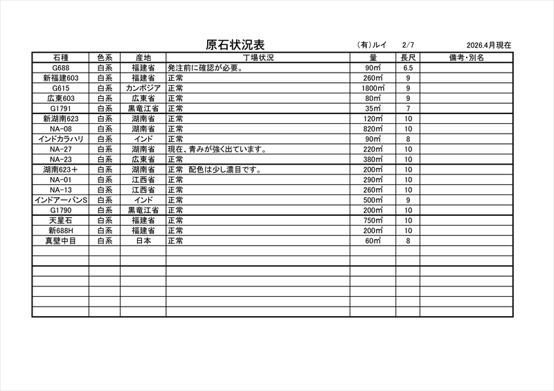 「正常」でない石種は、お手数ですが担当営業まで御確認願います。